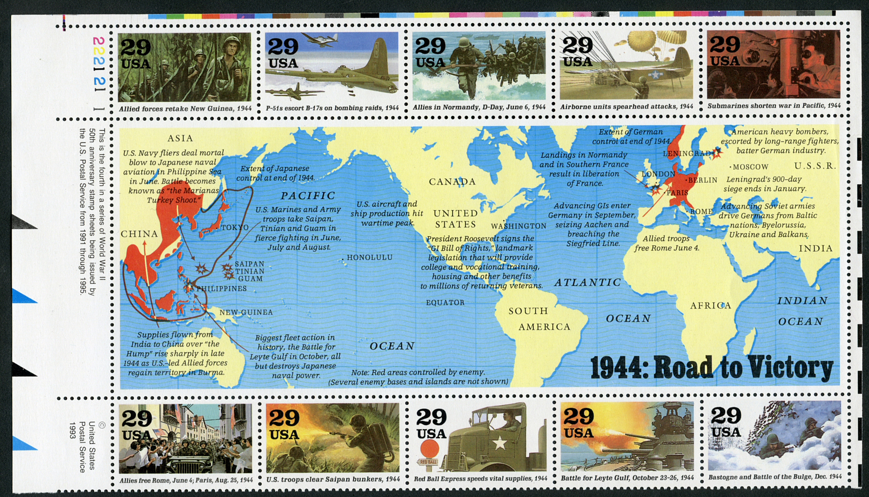 | Bloc feuillet US montrant les principales opérations militaires en 1944 tant en Europe que dans le Pacifique CLIQUER SUR LE BLOC POUR AGRANDIR |