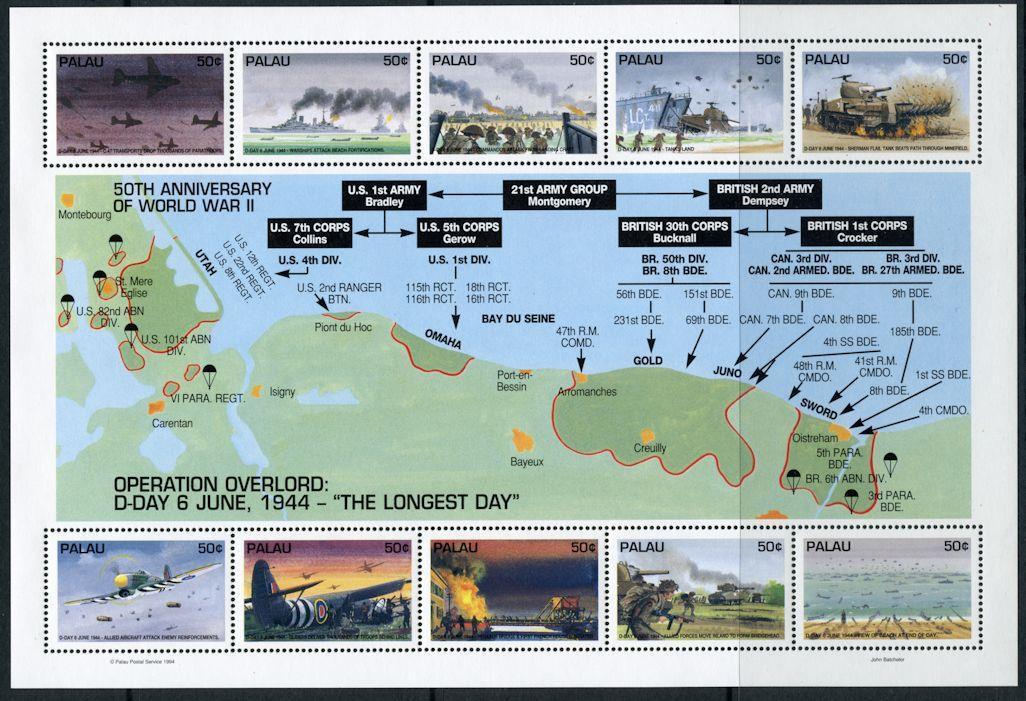| Principales unités débarquées le D-Day sur un bloc-feuillet des îles Palau CLIQUER SUR L'IMAGE POUR AGRANDIR |