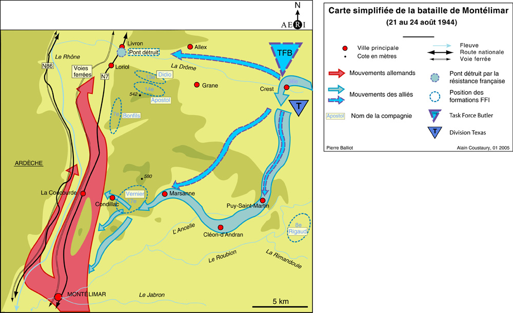 Dès le 19 août Hitler ayant donné l'ordre de repli, sauf pour les ports de Marseille et Toulon, la 19. Armee remonte par la vallée du Rhône et notamment la nationale 7 que les Américains de la 36th US Infantry Division vont tenter de bloquer à Montélimar (25-30 août).
