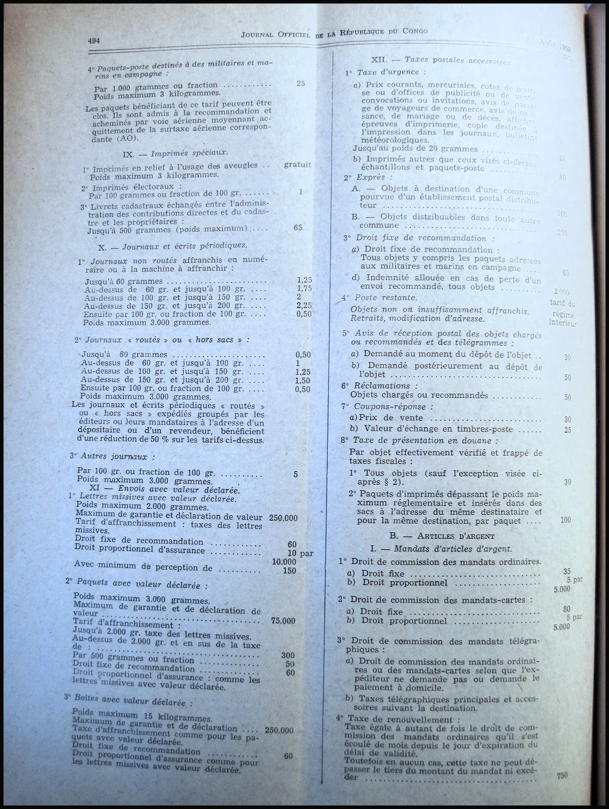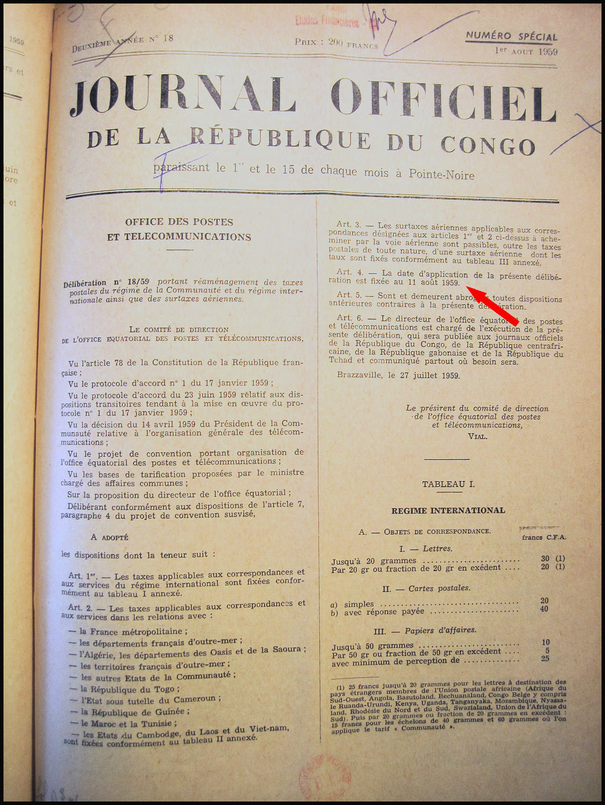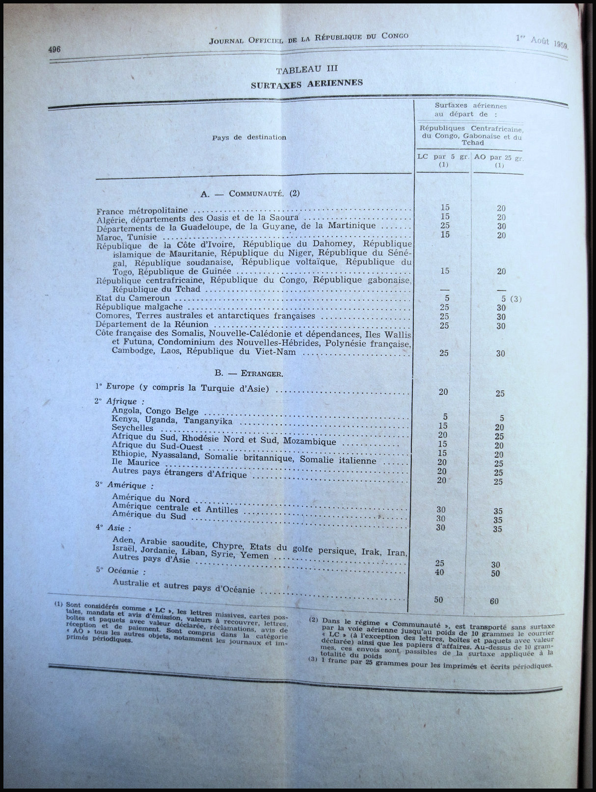 Tarif postal de l'Office Équatorial des Postes du 11 août 1959 applicable au Congo.