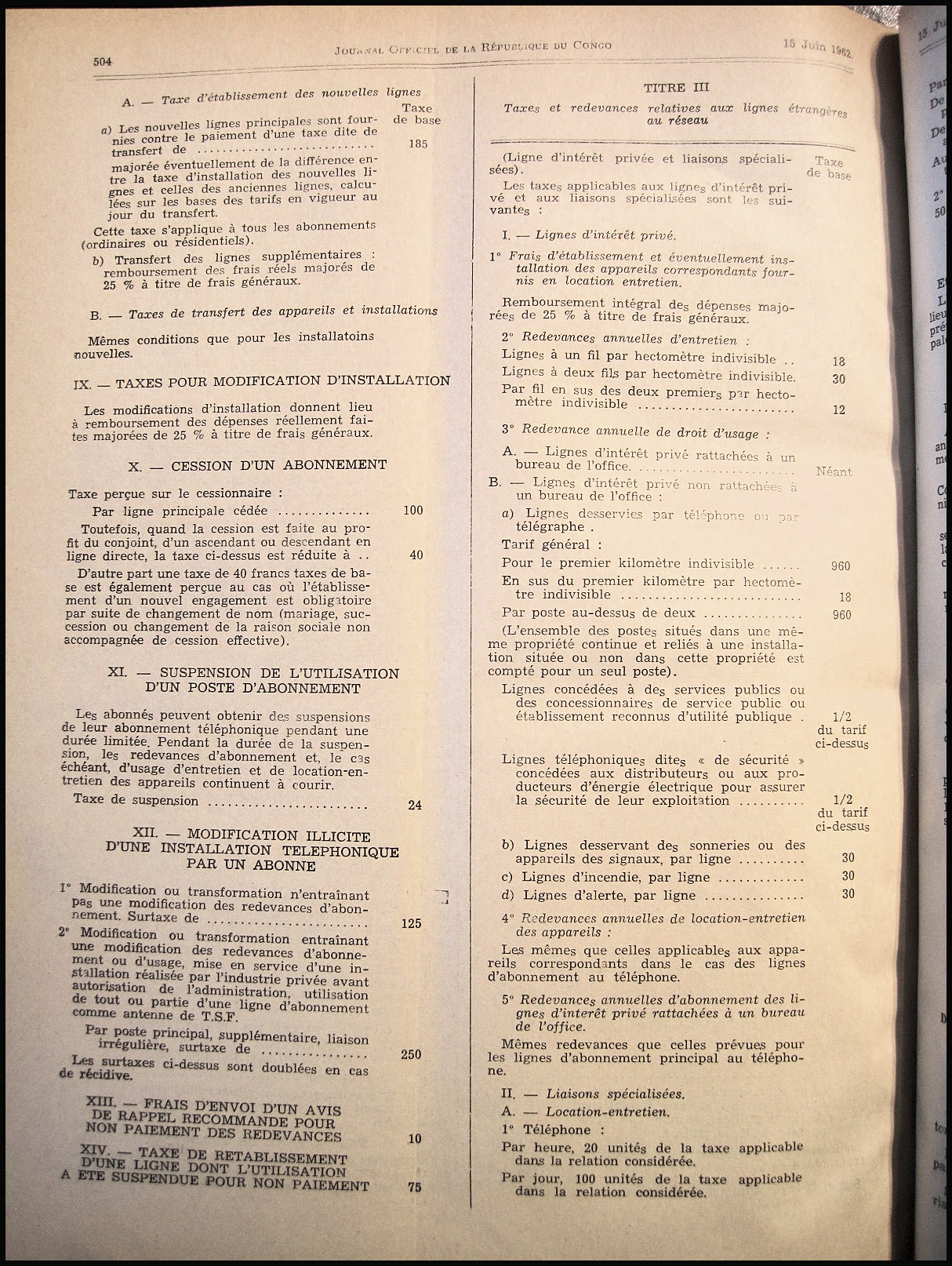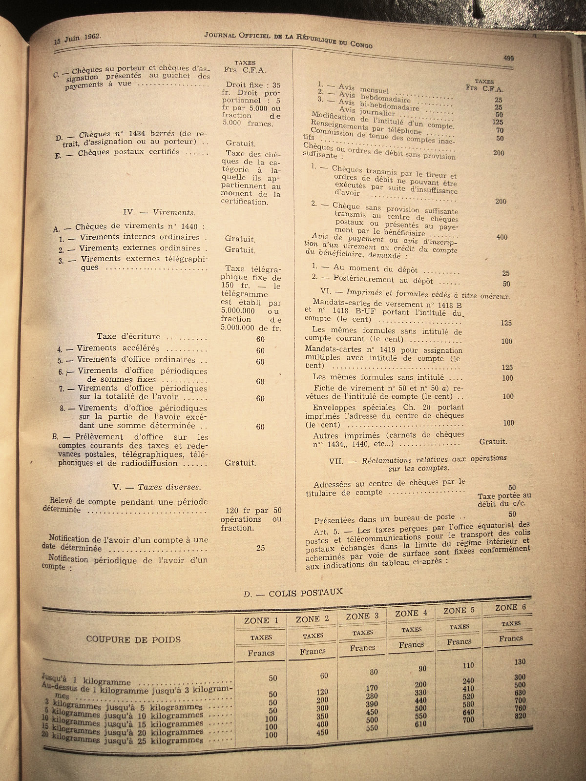 Tarif postal de l'Office Équatorial des Postes du 1er juillet 1962 applicable au Congo.