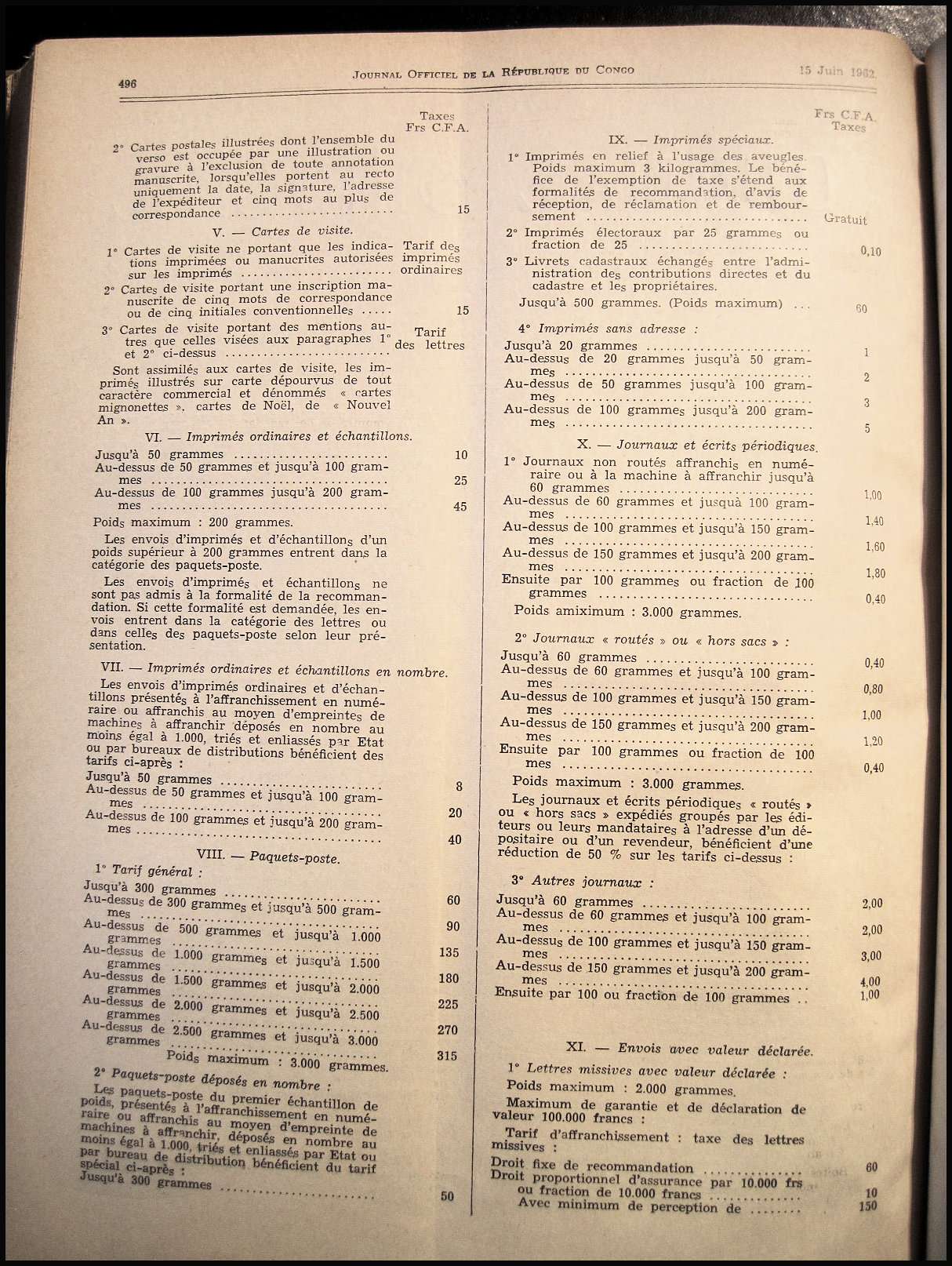 | Tarif postal de l'Office Équatorial des Postes du 1er juillet 1962 applicable au Congo page 11/12 CLIQUER SUR L'IMAGE POUR AGRANDIR |