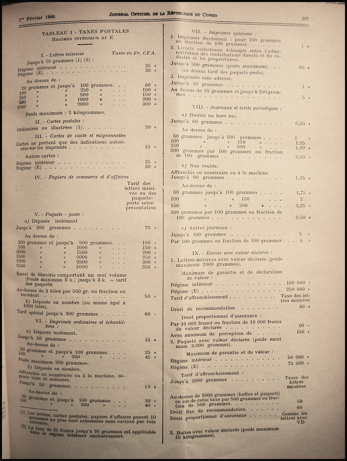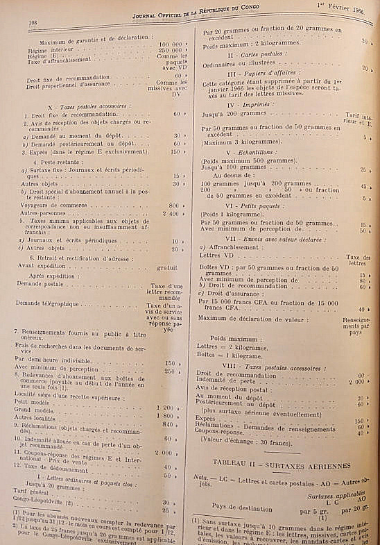 Tarif postal de l'Office des Postes et Télécommunications du Congo du 21 janvier 1966.