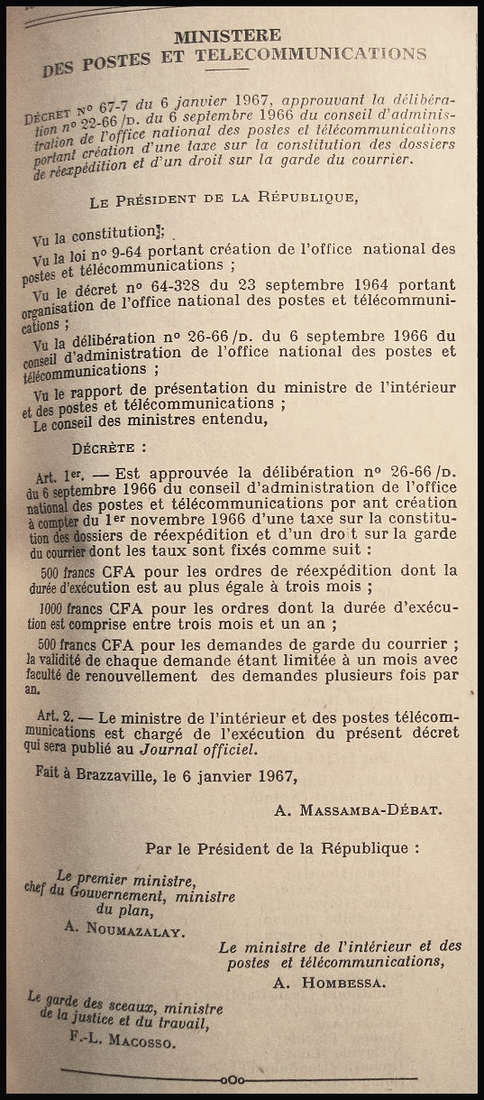 | Tarif postal du 6 janvier 1967 de l'Office des Postes et Télécommunications du Congo relatif aux taxes de réexpédition. CLIQUER SUR L'IMAGE POUR AGRANDIR |
