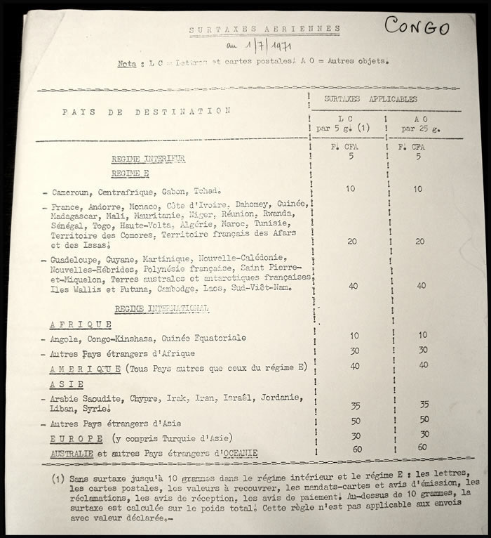 | Surtaxes aériennes au départ du Congo à compter du 1er juillet 1971 CLIQUER SUR L'IMAGE POUR AGRANDIR |