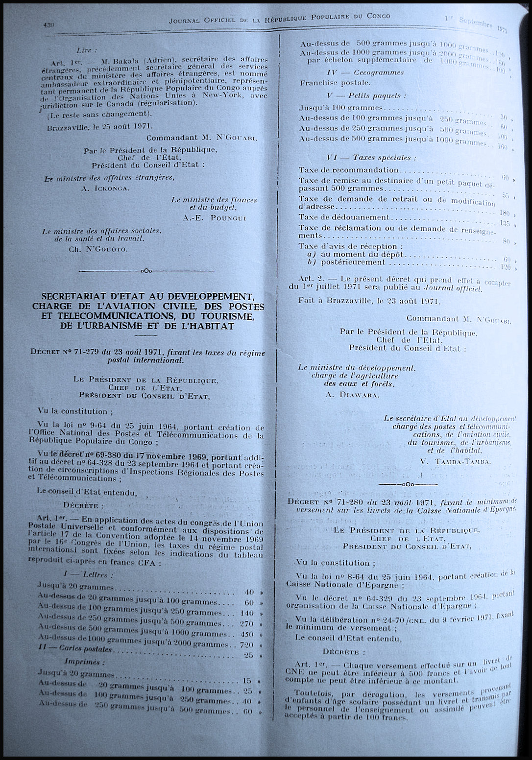 Tarif international au départ du Congo à compter du 1er juillet 1971 .